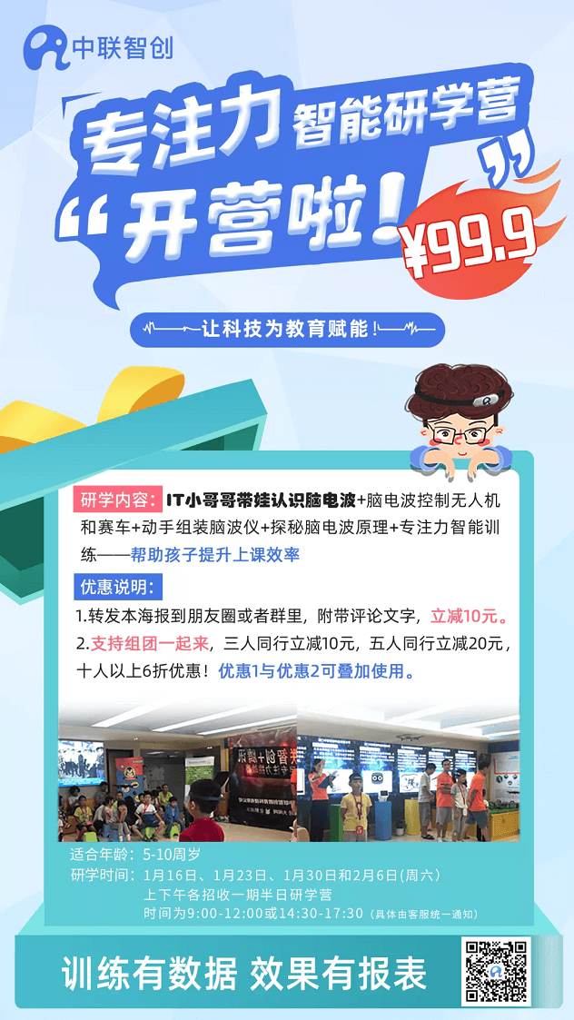 课程以脑科学与专注力为主题,通过多个互动及体验环节让孩子们认识脑电波感受专注力,培养专注创造思维,链接跨学科知识(如语文、数学、脑科学、信息技术等)。